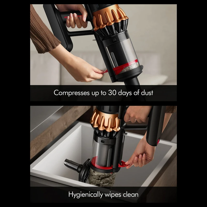 فناوری CleanCompaktor™ گردوغبار را حین نظافت فشرده میکند و امکان نگهداری آلودگی تا ۳۰ روز را فراهم میسازد. هنگام تخلیه نیز، مخزن بهصورت کاملاً بهداشتی پاک میشود و هیچ مو یا گردوغباری باقی نمیماند.