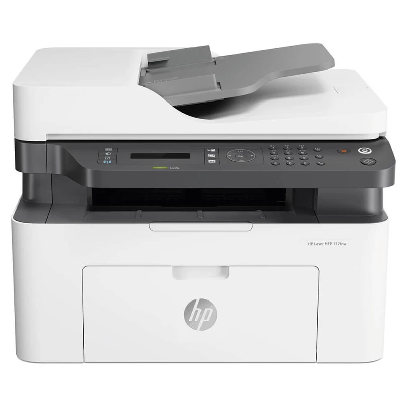 پرینتر اچ پی تک رنگ چهار کاره با چاپ لیزری مدل Laser MFP 137fnw، سایز چاپ A4، قابلیت چاپ دو رو، چاپ بدون حاشیه، اتصال به WiFi، دارای صفحه نمایش LCD